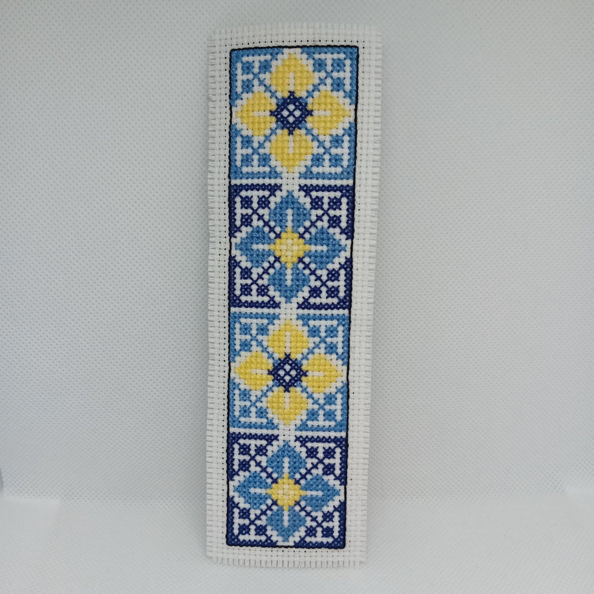 The blue tiles bookmark is stitched on a black felt.