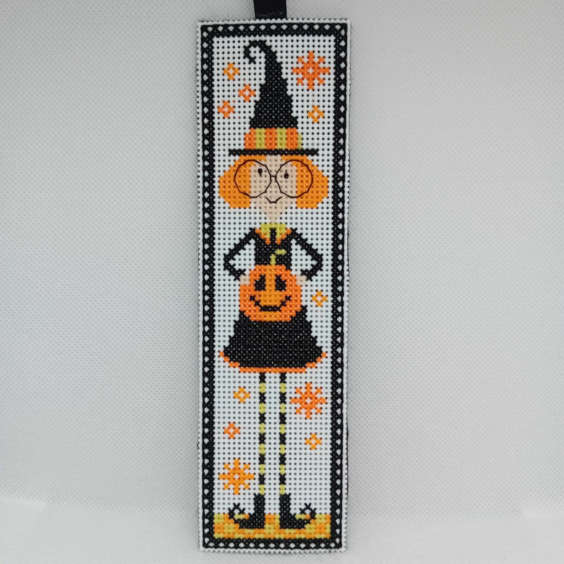 The witch Halloween bookmark is stitched on a black felt and black ribbon.